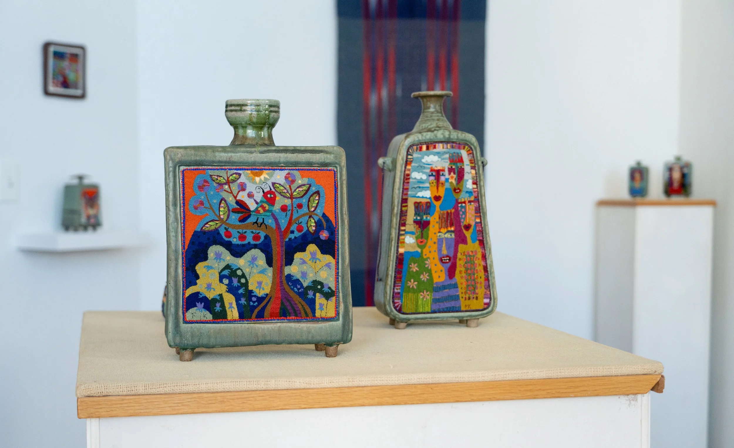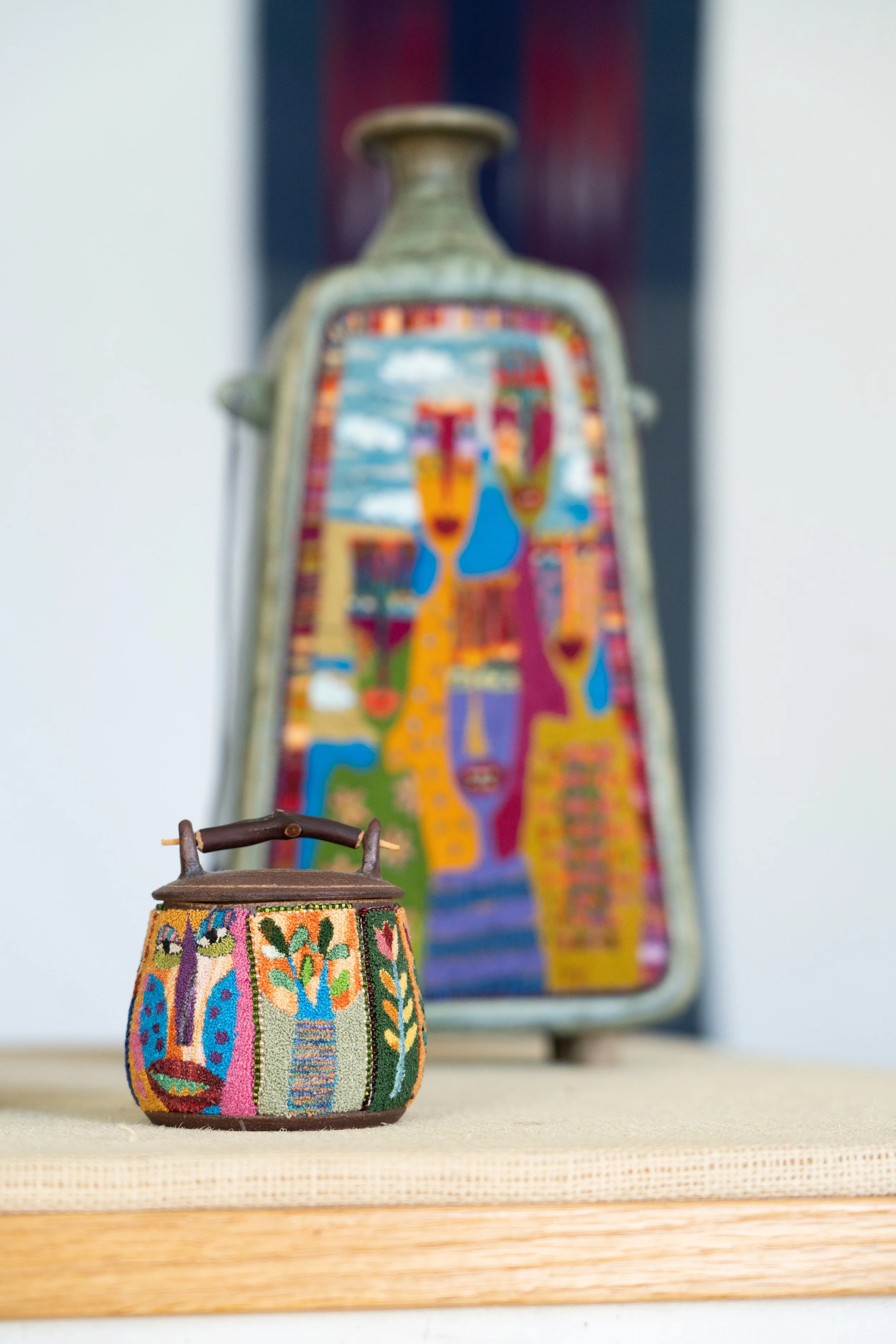 In 2003, the couple moved to Bellingham to be close to Kondo’s daughter, Denise. Though Bellingham was their home, the pair travelled everywhere together. They criss-crossed the United States countless times en route to craft shows, they travelled to Guatemala, Puerto Rico, Mexico and Peru, where they explored the local fiber arts traditions, and they even went as far afield as New Zealand. As much as they loved travelling, however, Peggy and Larry mostly just loved being together: making art at home in their neighboring studios, collaborating and just going to the grocery store. Despite everything she had been through in her life, Peggy’s sense of humor was unbeatable. It is present in her artworks to this day.